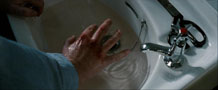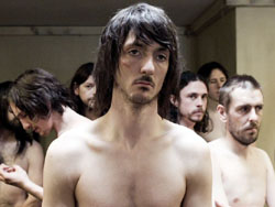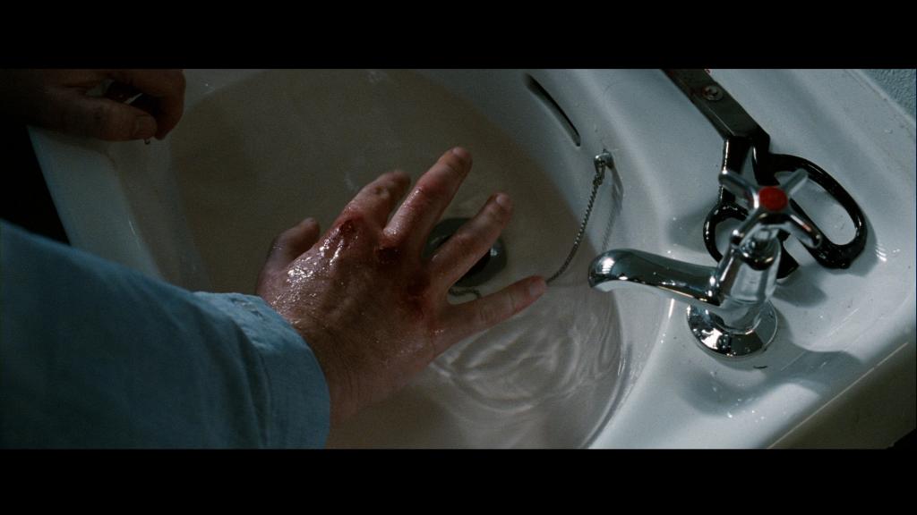 Prison Guard Raymond (Stewart Graham) plays a pivotal role in the beginning third of the film as his fear and anger on the outside world fuel is cruelty on the inside of the H-Blocks of Her Majesty’s Prison Maze. He is the first character met, followed by his wife as she holds her breath in anticipation of her husband’s car exploding upon ignition. We follow Raymond to work, through the door for employees and into the locker room where the guards are changing for duty. There are bit shots of Raymond early on in the film as his day goes on, getting more and more worn down until, drenched in what appears to be sweat, takes a smoke break to calm his nerves and allow his bloodied knuckles a chance to throb in peace. Raymond’s last appearance in Hunger reinforces the notion that violence begets violence in a very literal, brutal scene.